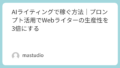 ビジネスメールの効率化にも興味がある方はChatGPTでビジネスメールを作成する方法もおすすめです。その他のAI仕事術はAIプロンプト活用ブログでもご紹介しています。